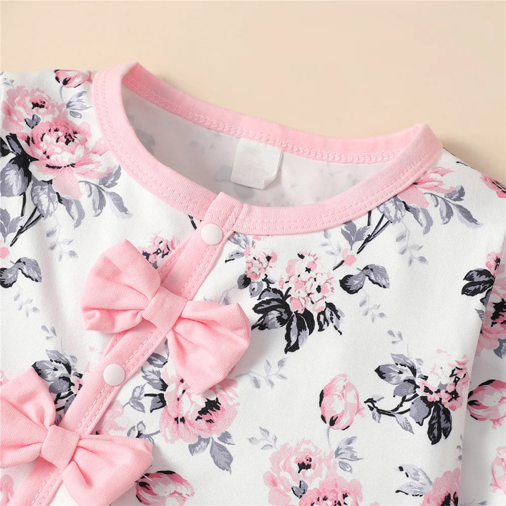 Grenouillère Bébé Fille Fleurie – Manches Longues, Nœud Chic | 0–18 Mois