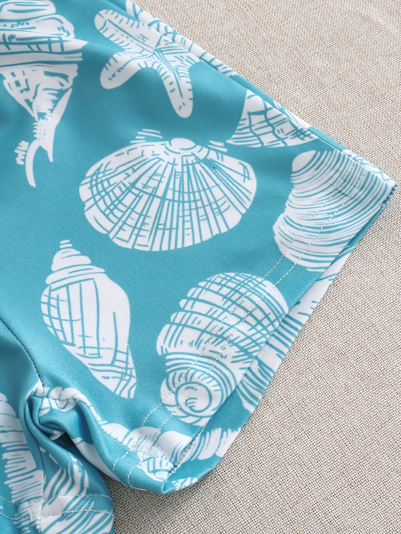 Cet ensemble comprend un débardeur à col rond, un short à taille élastique avec cordon ajustable et un chapeau assorti, le tout décoré de jolis motifs marins (étoiles de mer et coquillages).