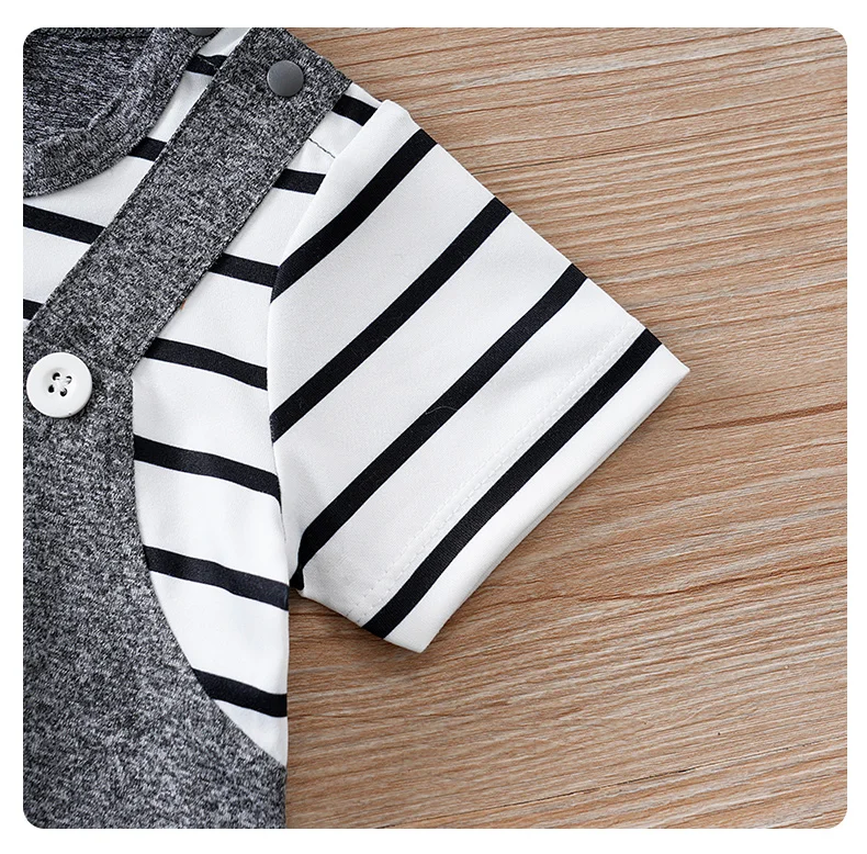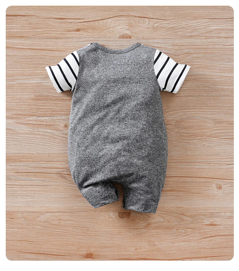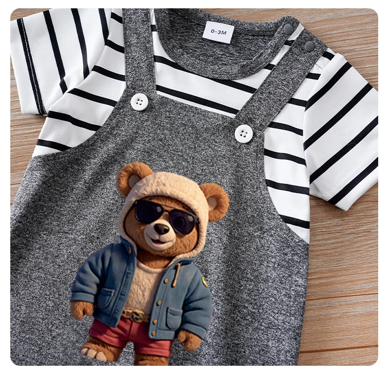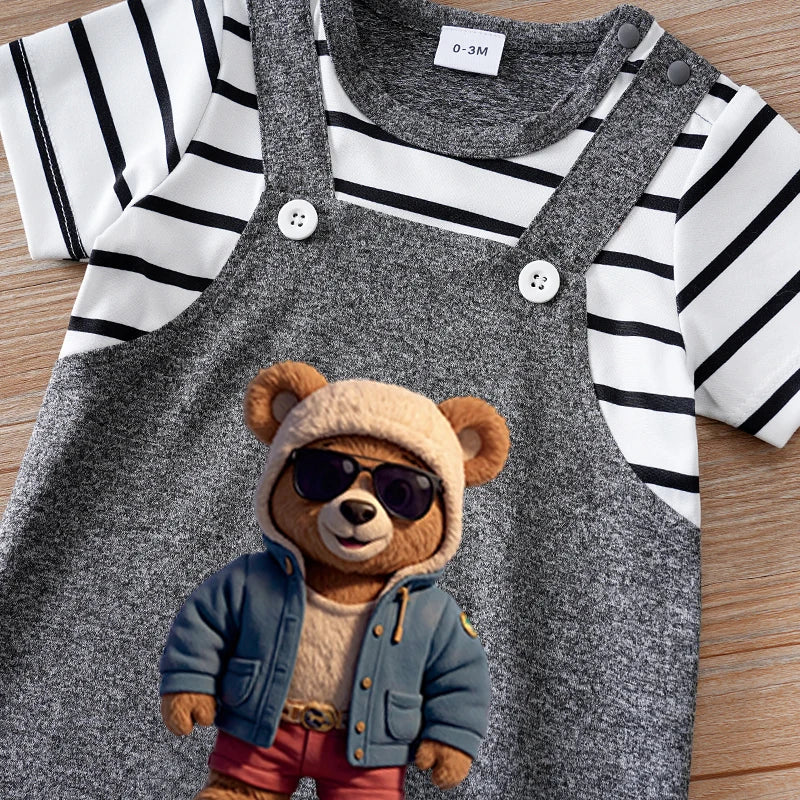 Barboteuse d'été 2 pièces à manches courtes et col rond rayé à motifs d'ours pour bébés garçons et filles en gris foncé.