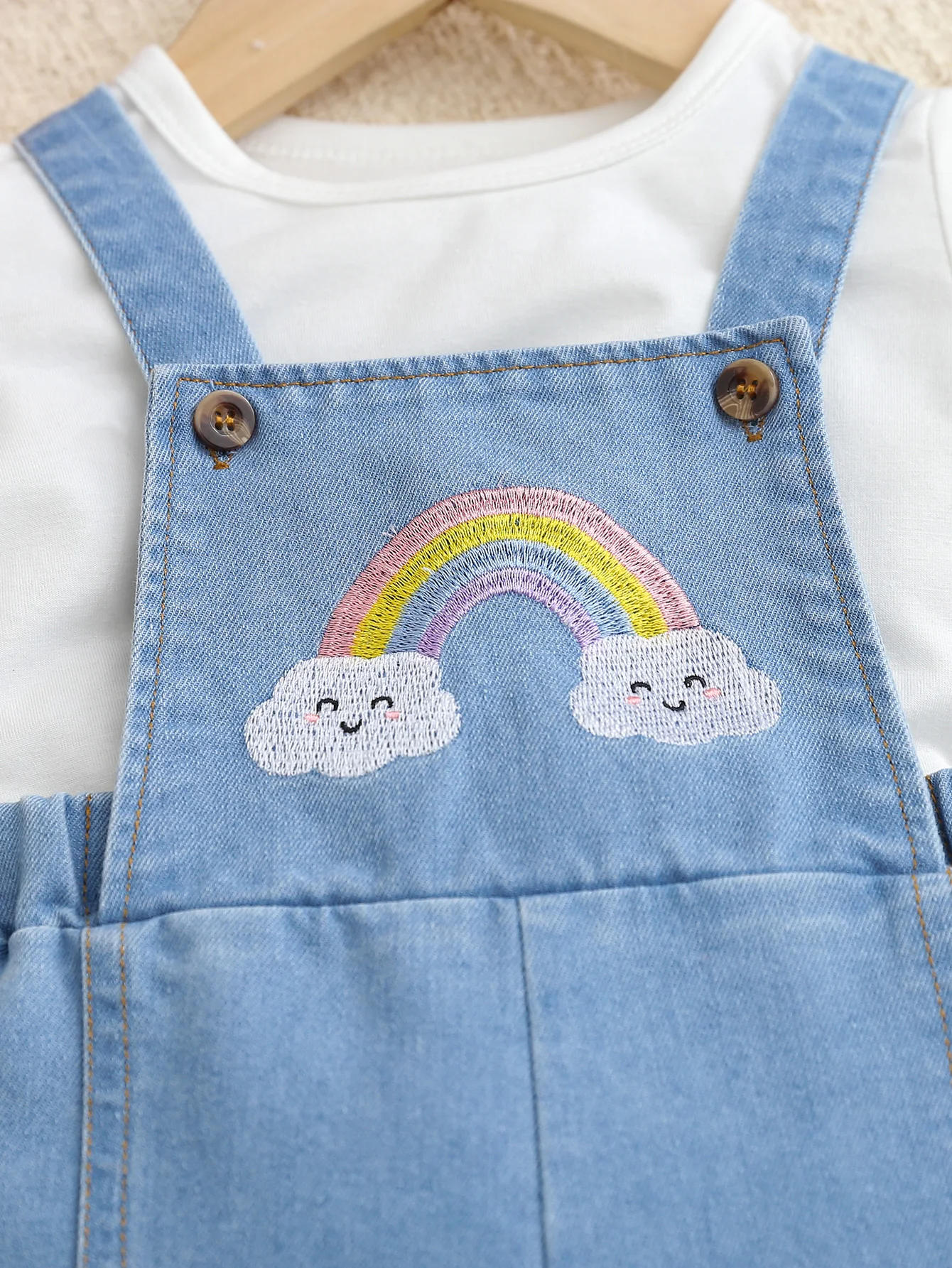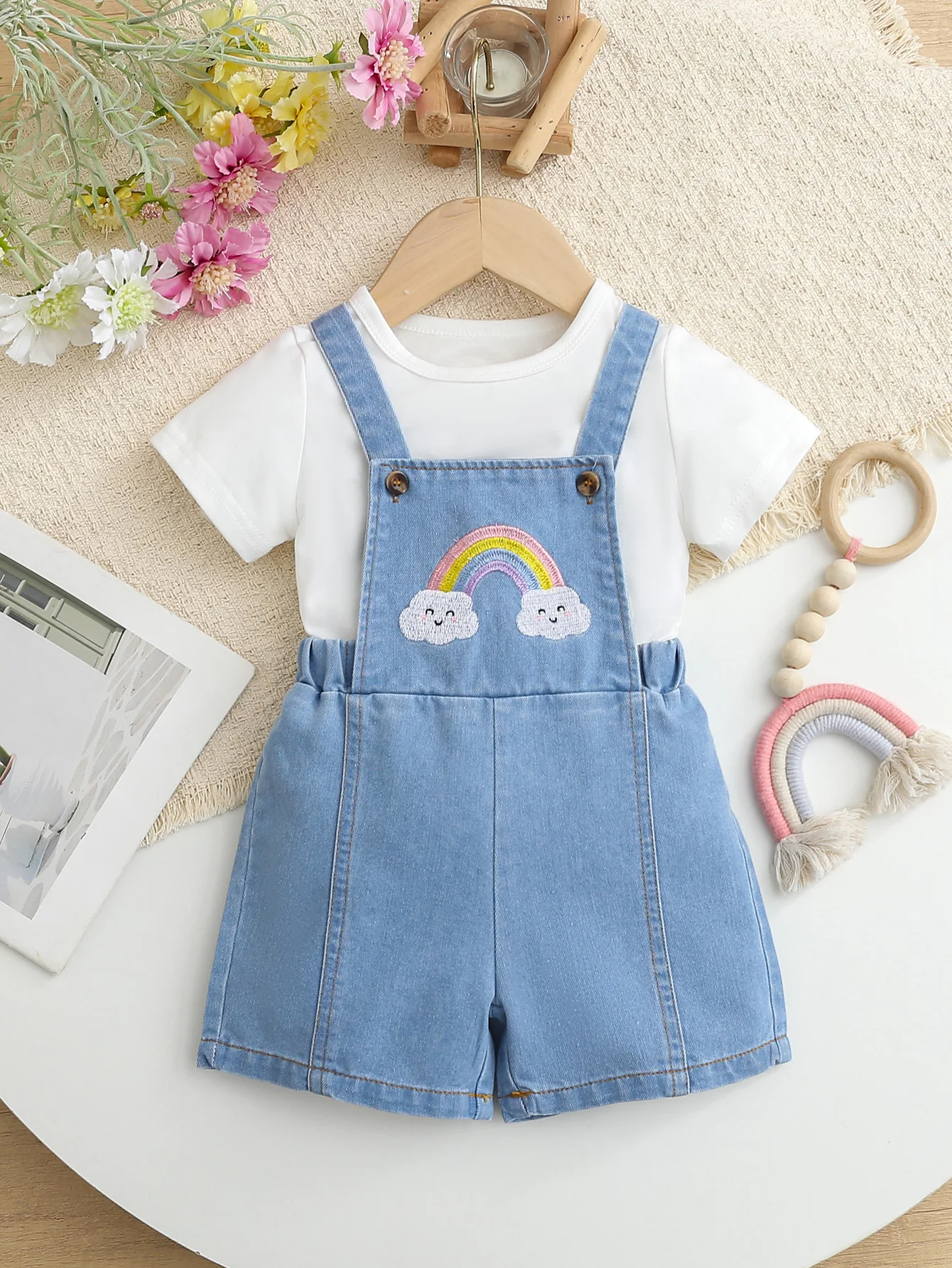Offrez à votre bébé fille une tenue confortable et pleine de charme avec cet ensemble d’été 2 pièces composé d’un t-shirt blanc doux et d’une salopette légère en jean ornée d’un joli motif arc-en-ciel.
