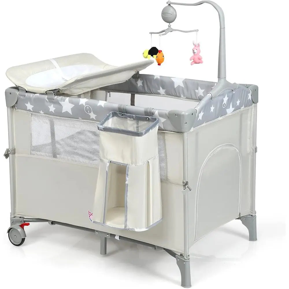 Jardin de jeu portable 5 en 1 avec couffin, table à langer, rangement, archet de jouets et boîte à musique (Beige)