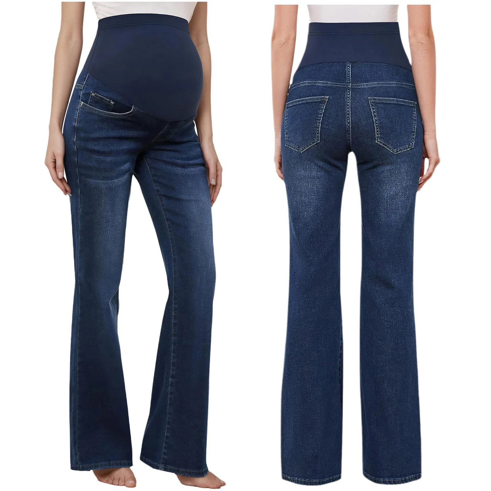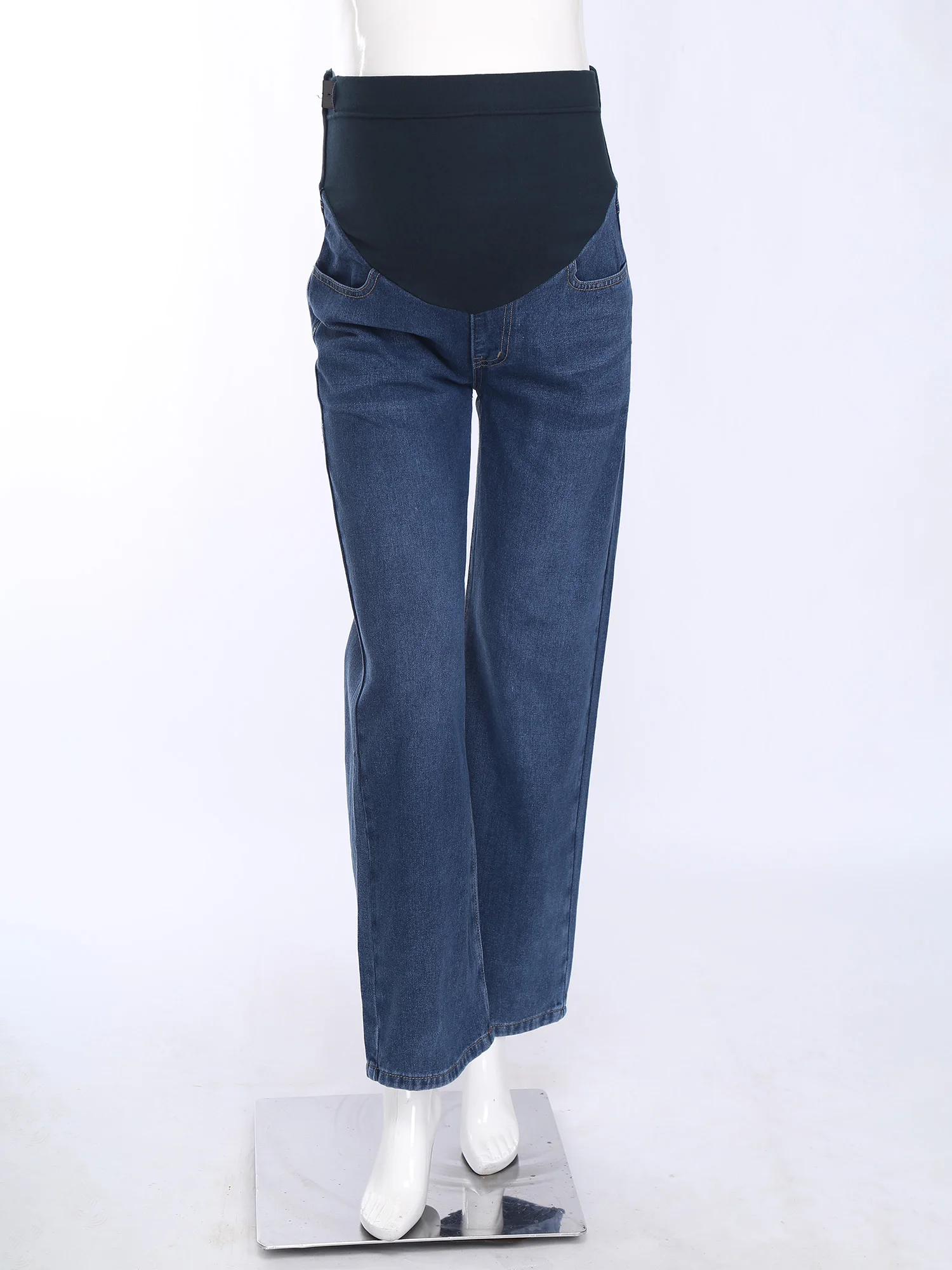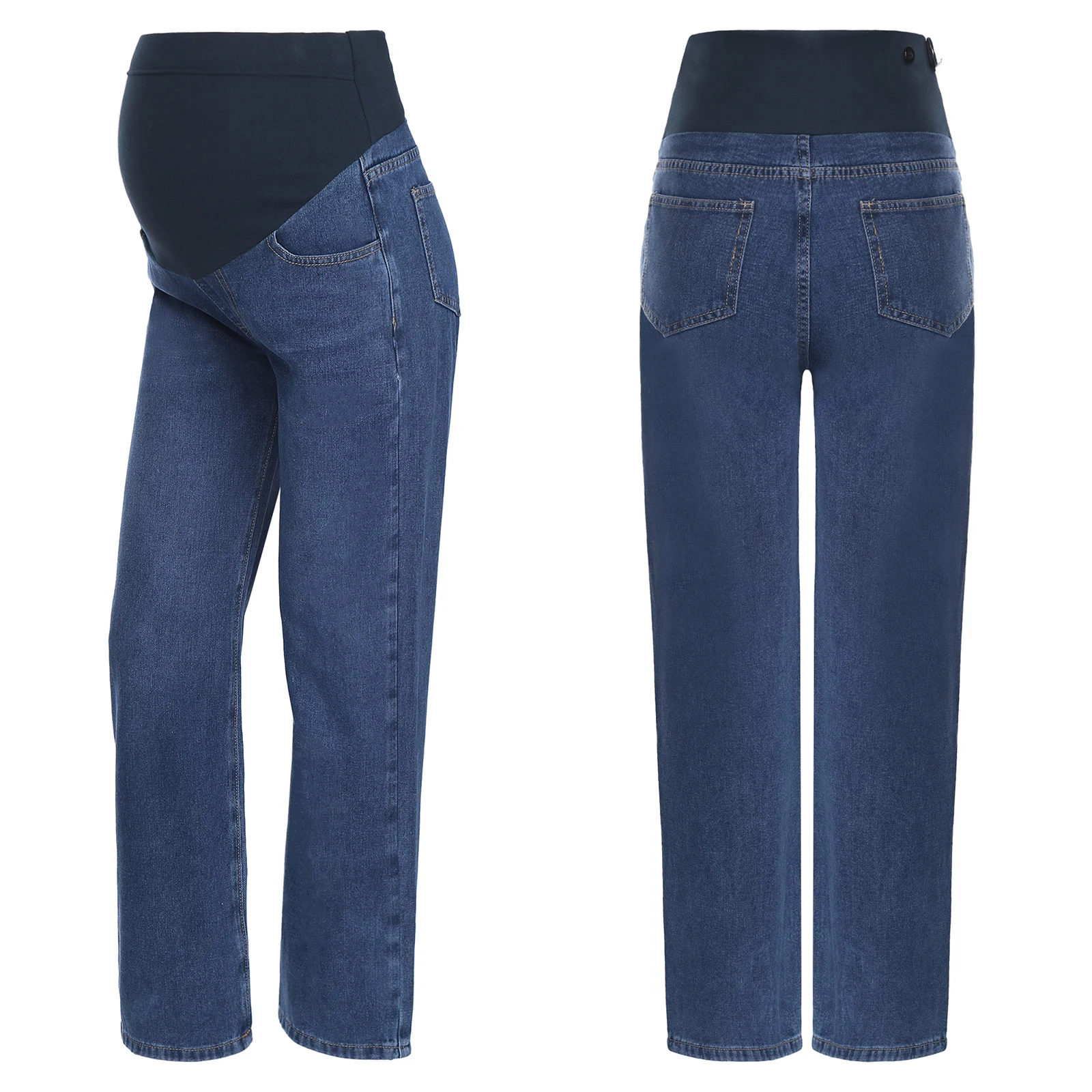 Disponibles dans les couleurs classiques bleu clair et bleu foncé, ces jeans sont à la mode et peuvent être assortis à divers hauts, ce qui en fait un ajout polyvalent à la garde-robe d'une femme enceinte.