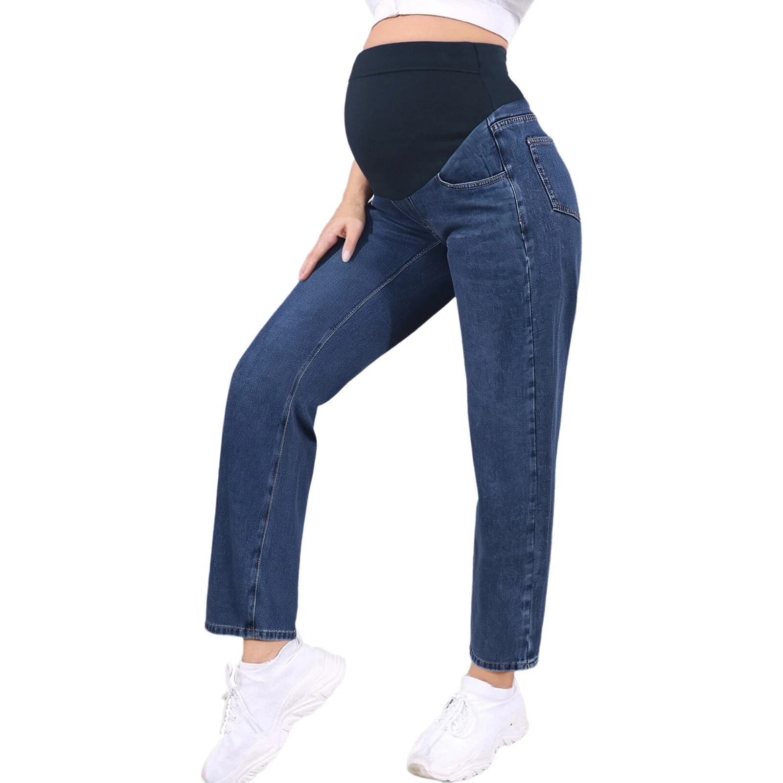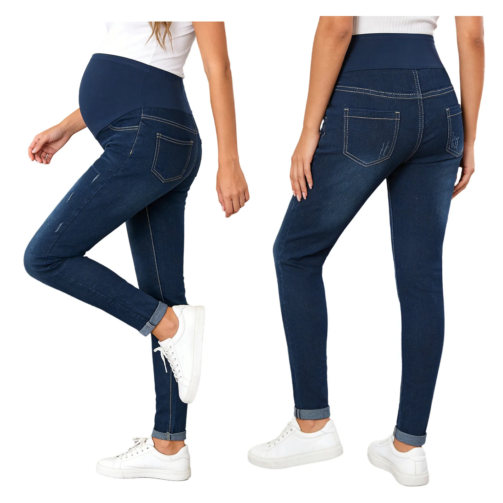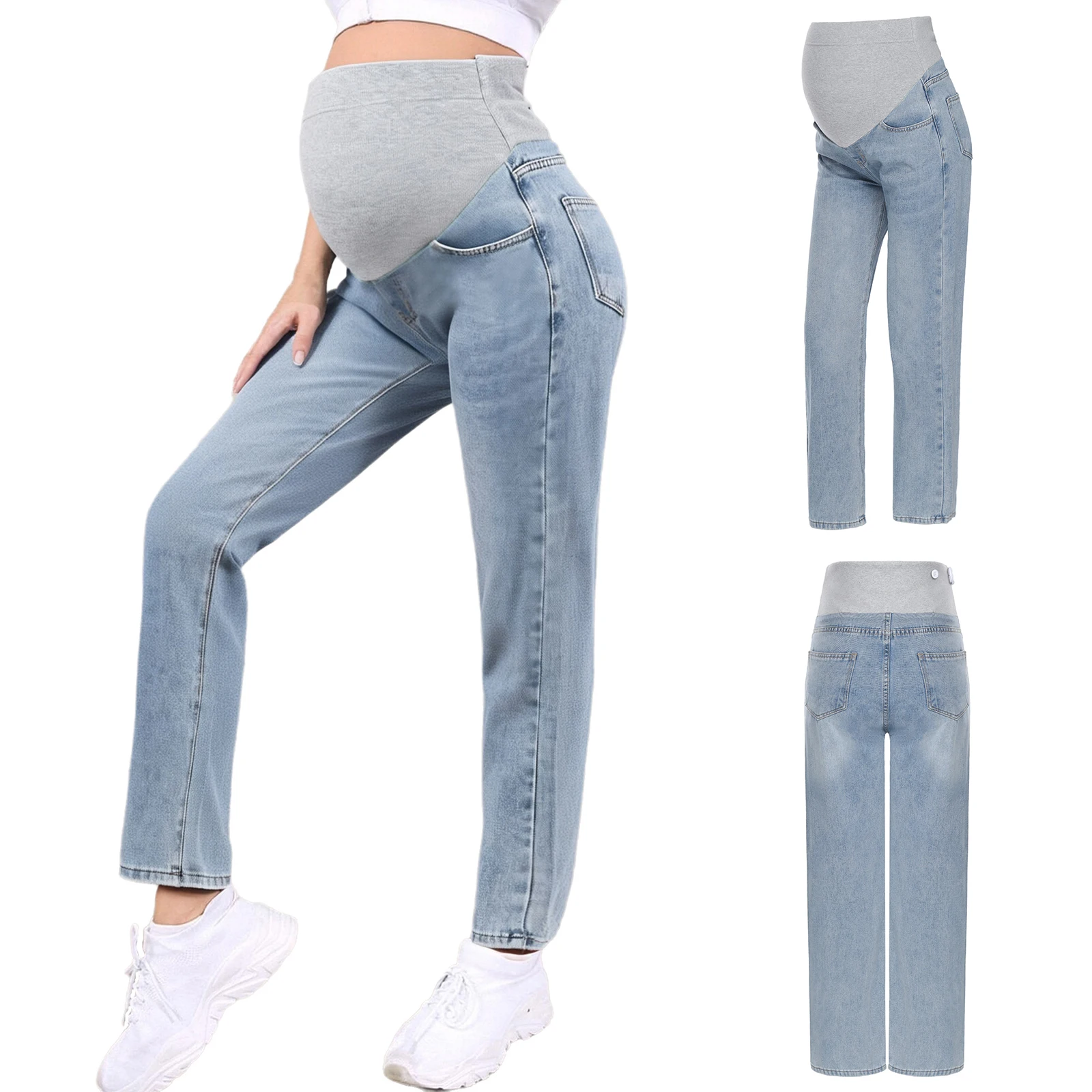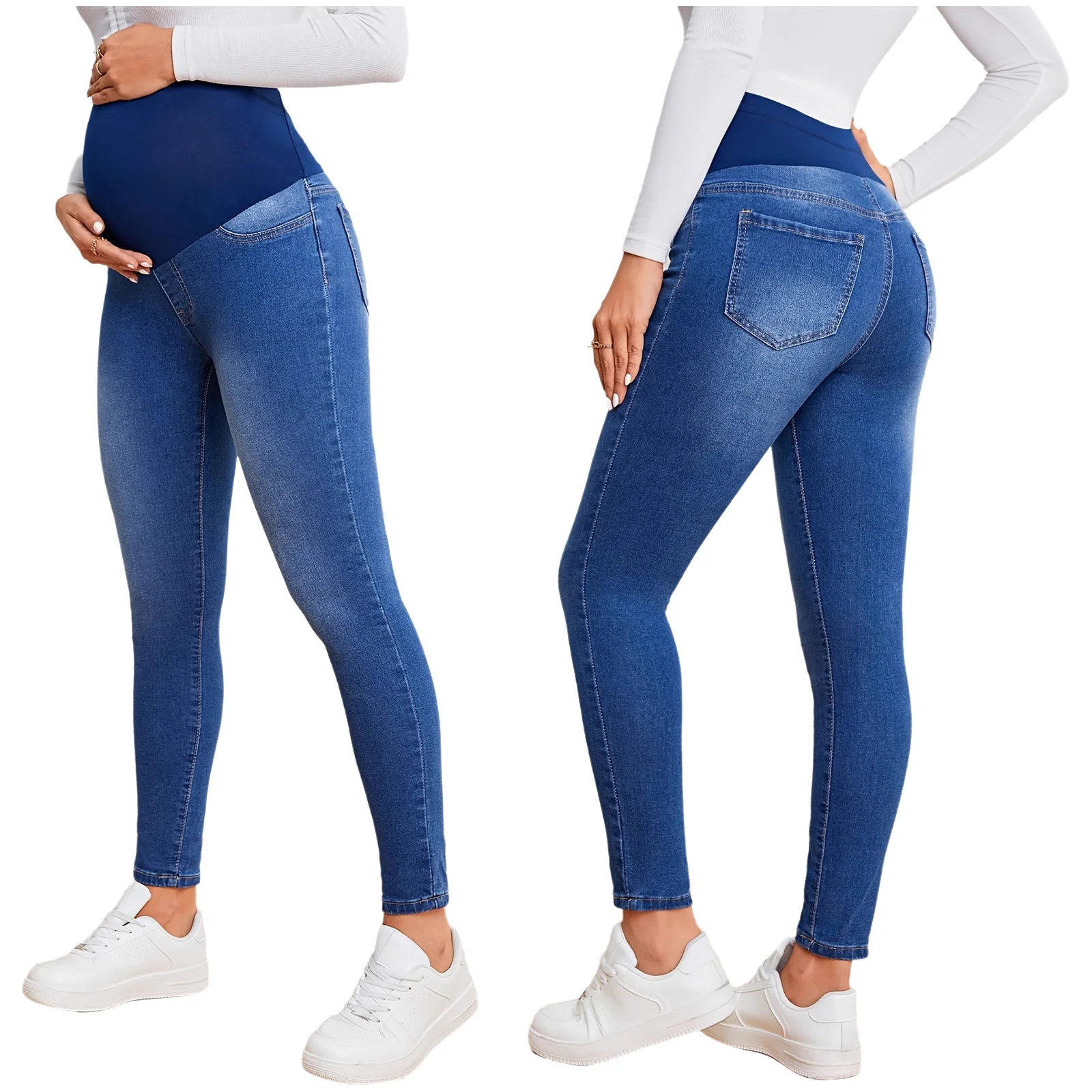 Disponibles dans les couleurs classiques bleu clair et bleu foncé, ces jeans sont à la mode et peuvent être assortis à divers hauts, ce qui en fait un ajout polyvalent à la garde-robe d'une femme enceinte.