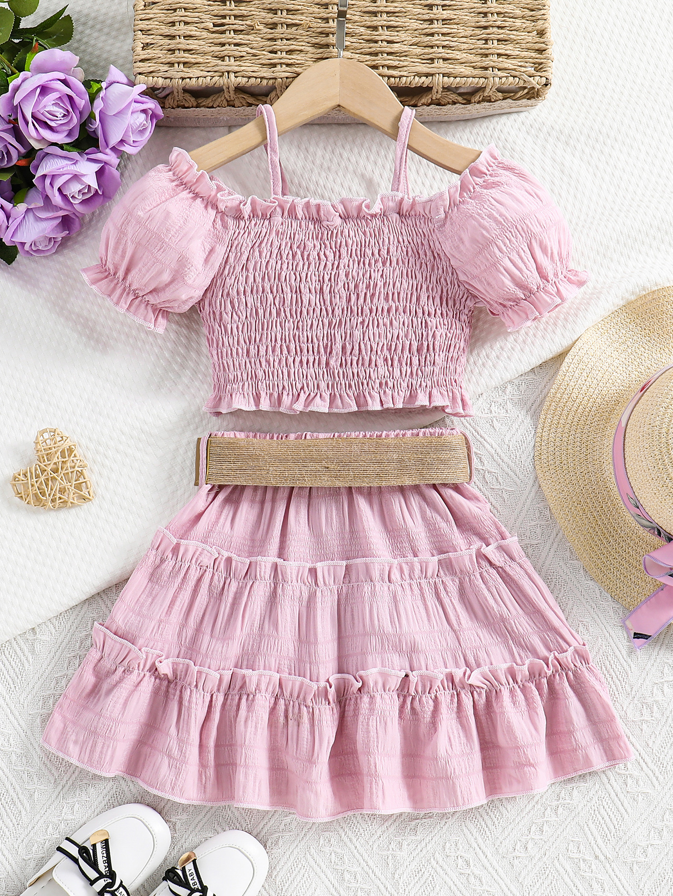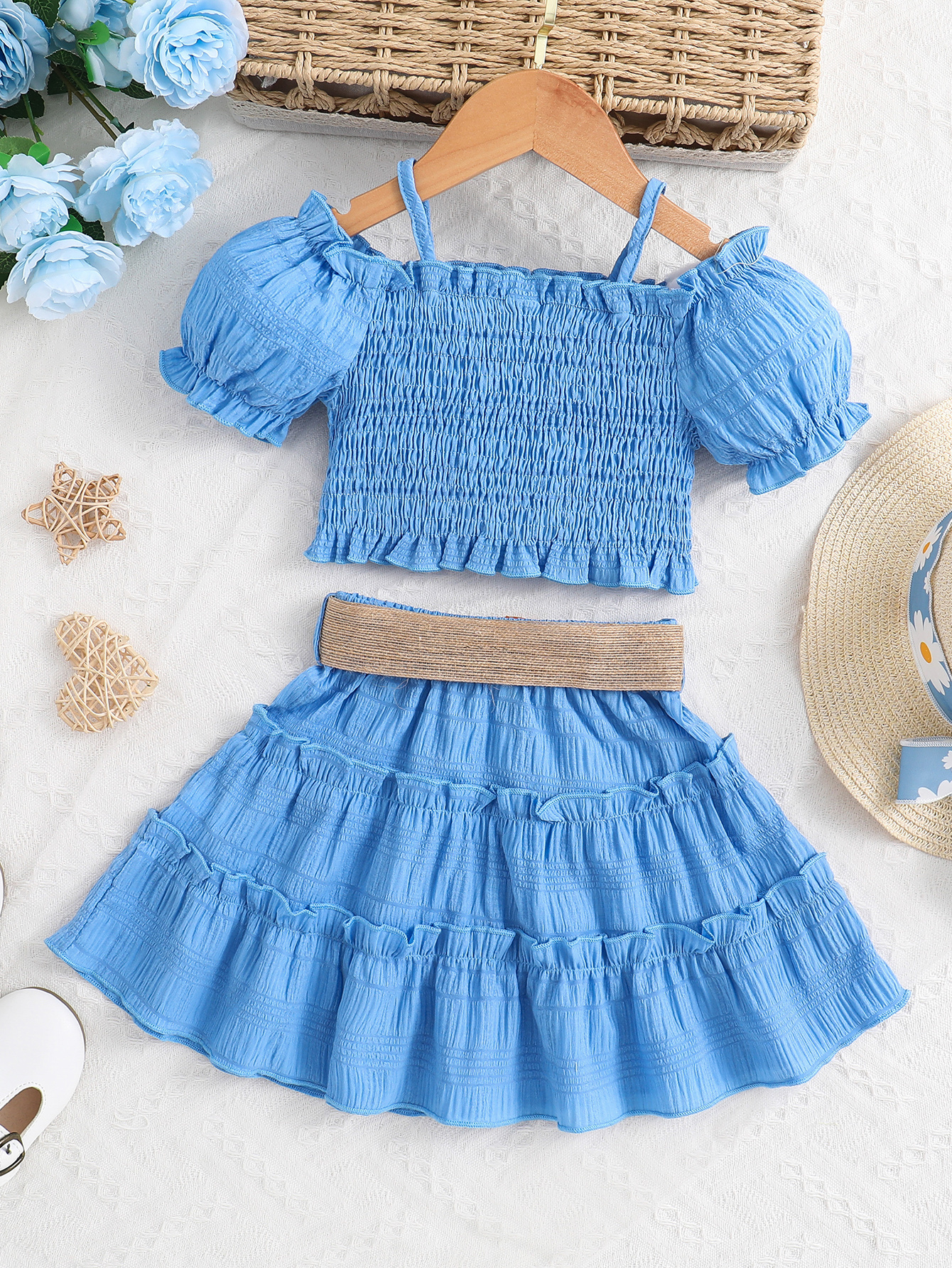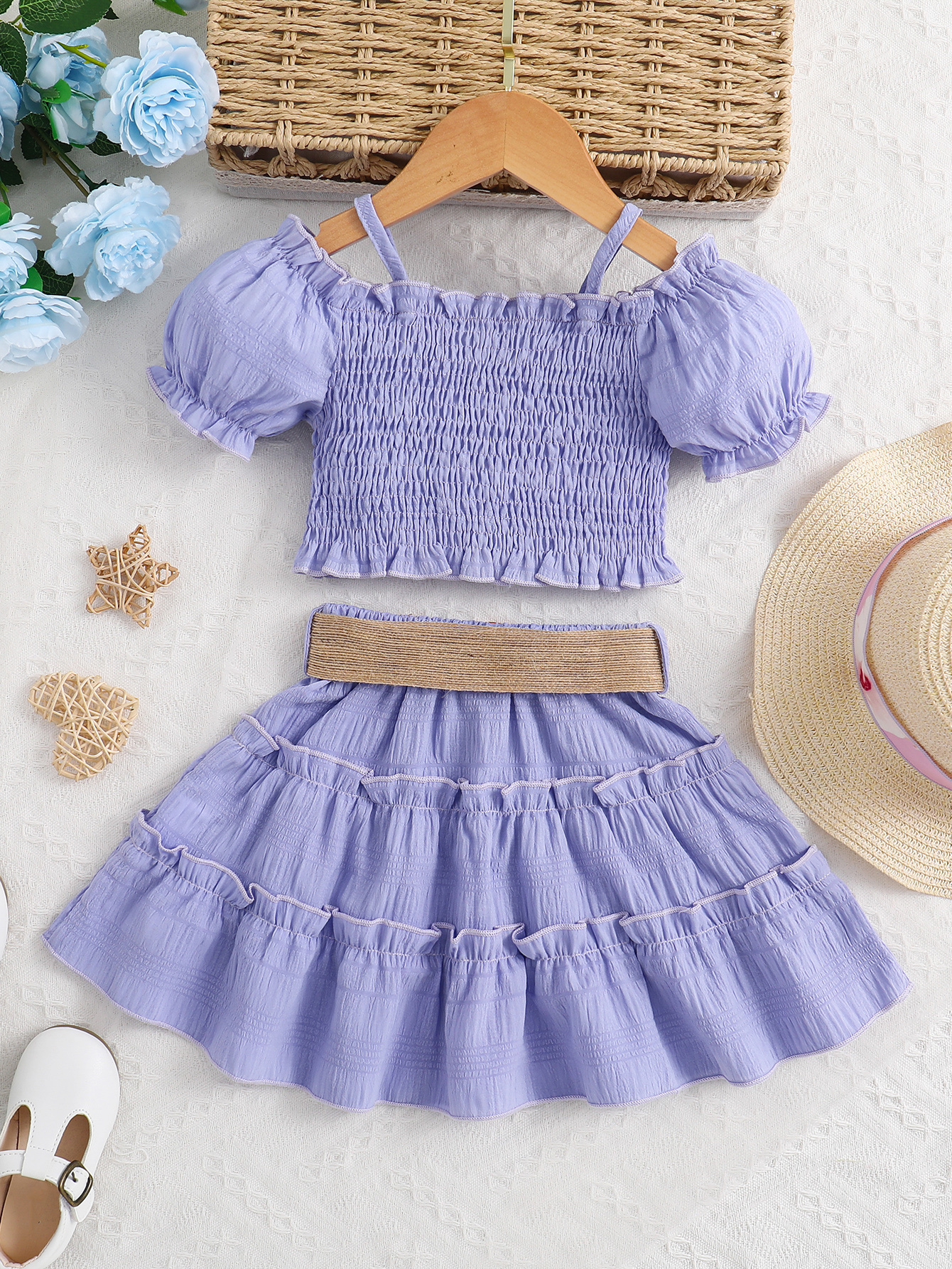 Cet ensemble jupe et haut épaules dégagées est parfait pour l’été. Léger, confortable et élégant, il accompagne votre enfant lors des journées chaudes tout en lui offrant un style adorable digne d’une petite princesse.