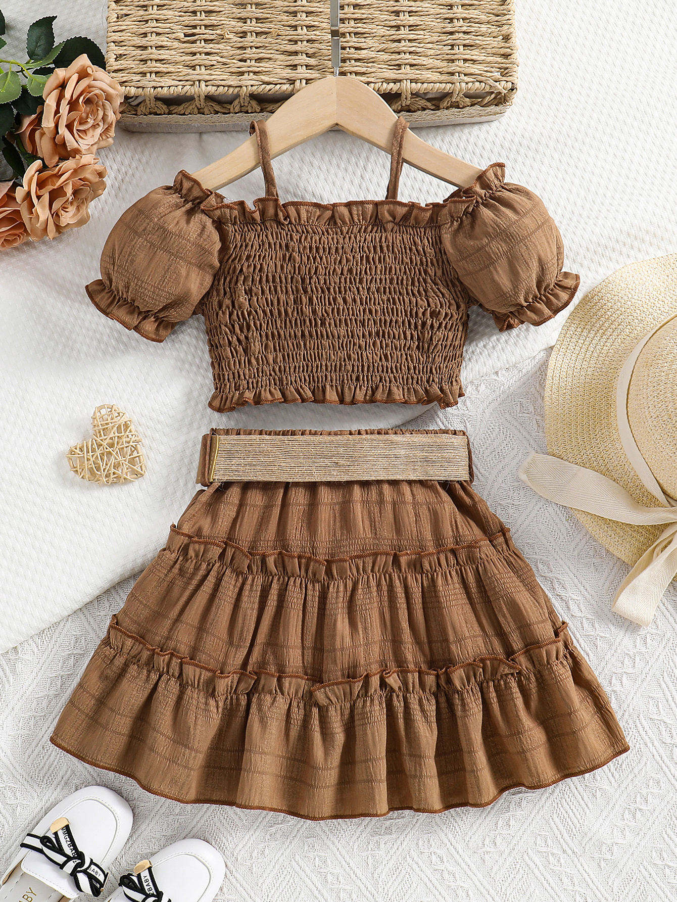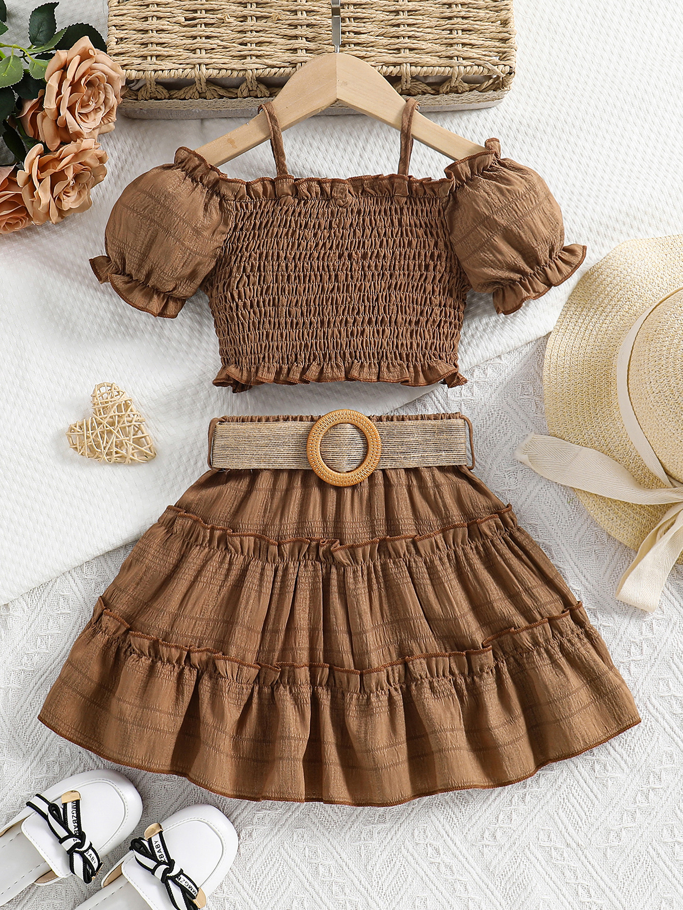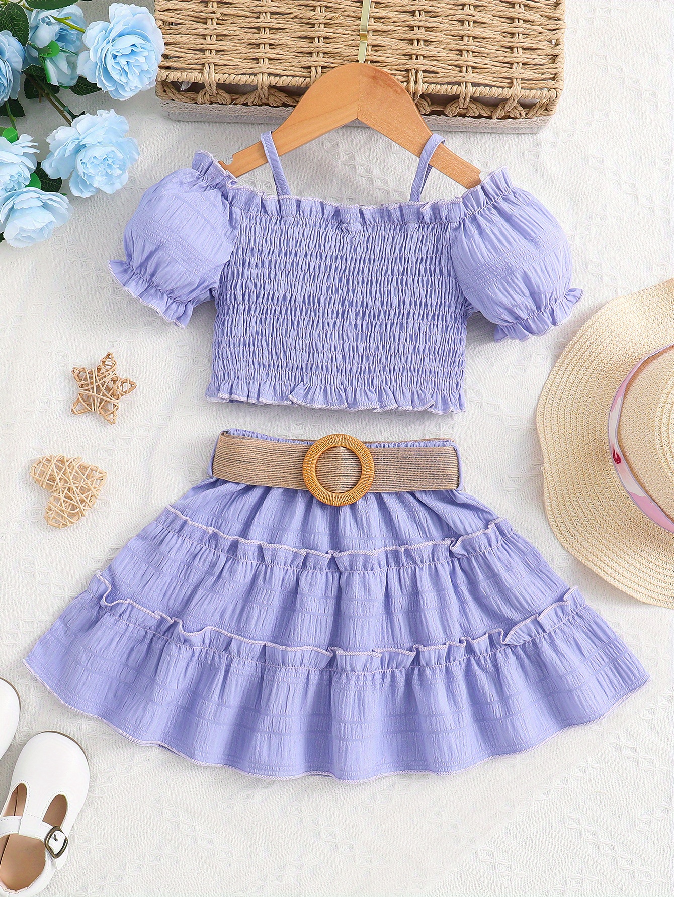 Cet ensemble jupe et haut épaules dégagées est parfait pour l’été. Léger, confortable et élégant, il accompagne votre enfant lors des journées chaudes tout en lui offrant un style adorable digne d’une petite princesse.