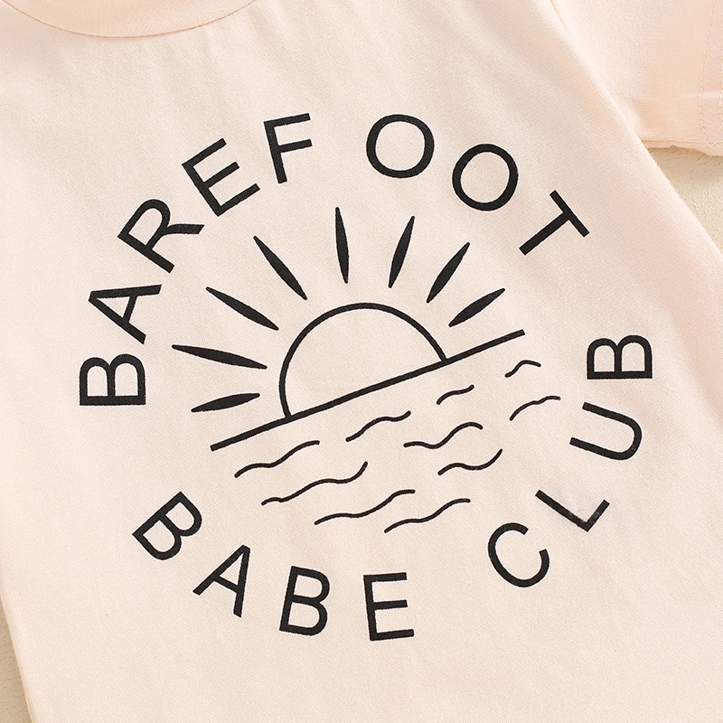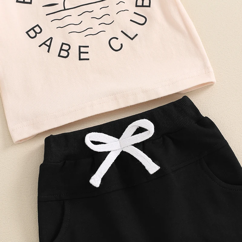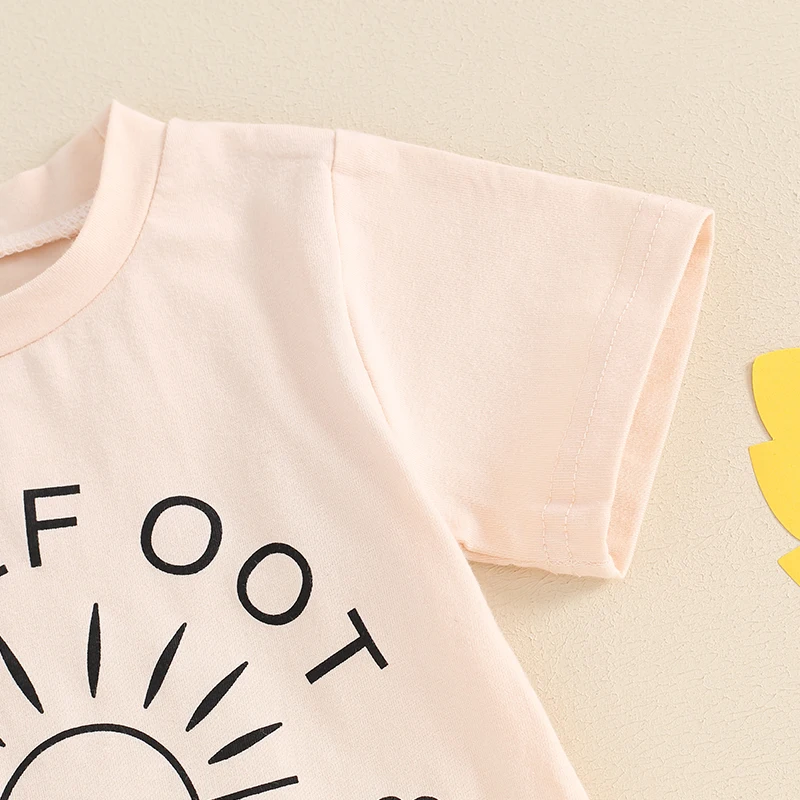 Il se compose d’un t-shirt à manches courtes avec imprimé soleil et message tendance, associé à un short souple à taille élastique, idéal pour bouger librement.