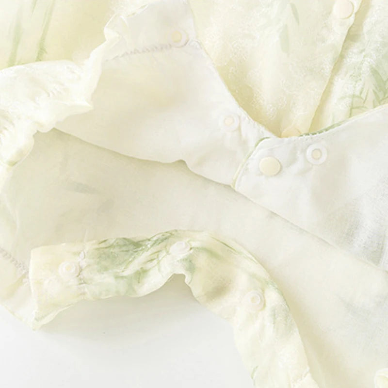 Cette combinaison pour bébé fille s’inspire du style traditionnel chinois Cheongsam, revisité avec une touche moderne et enfantine. Son motif panda adorable et ses finissions vert pastel apportent élégance et originalité à la tenue.