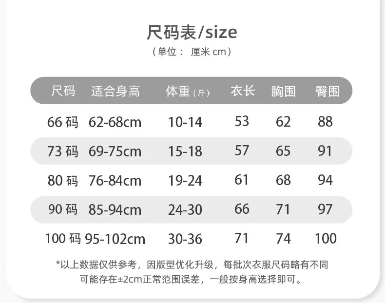 Size 73: age: 6-10 months; weight: 7.5-9kg ; height: 69-75cm